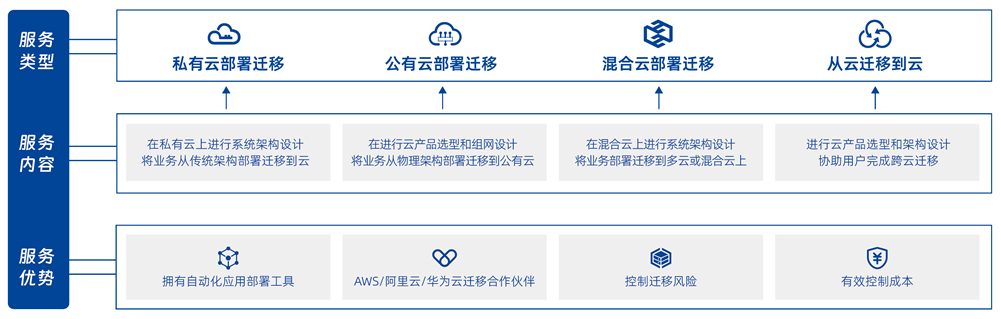 提供业务上云及云间迁移的端到端服务,,,评估业务系统现状,,,规划设计迁移架构、、、迁移技术和迁移方案,,,,应用及数据上云迁移实施,,,云上系统部署,,,,云上数据及业务验证,,,迁移后运维保障及持续优化服务。。。。